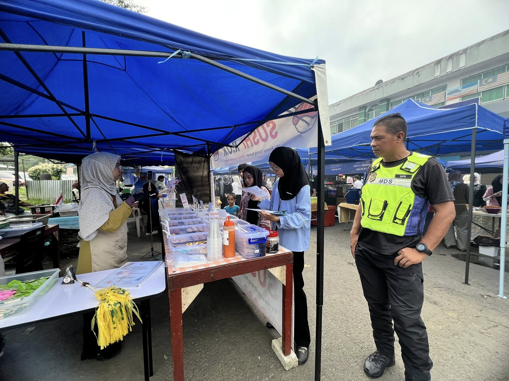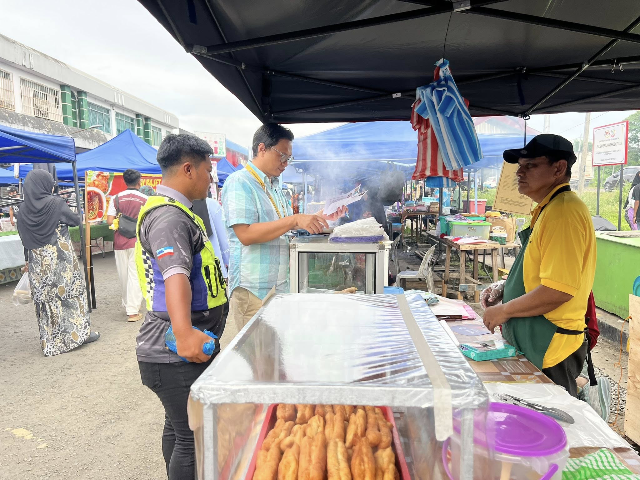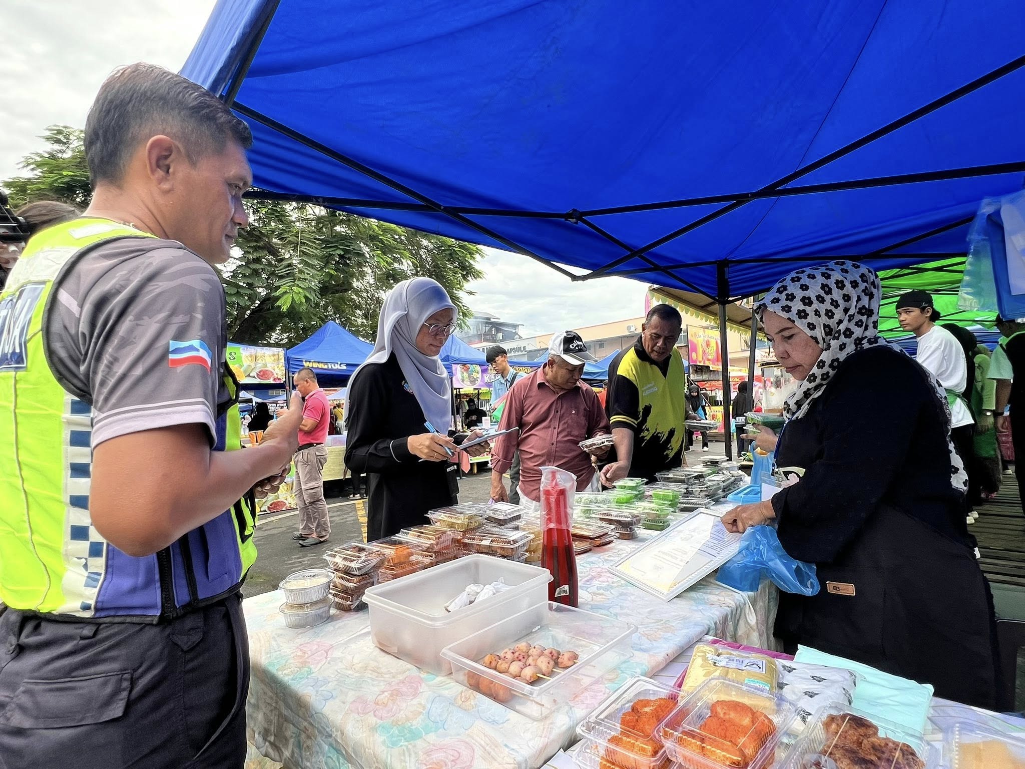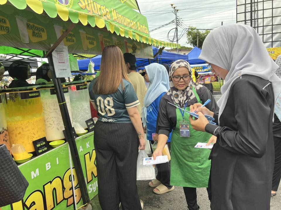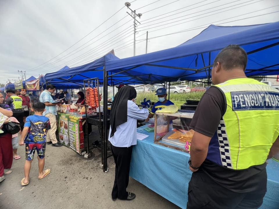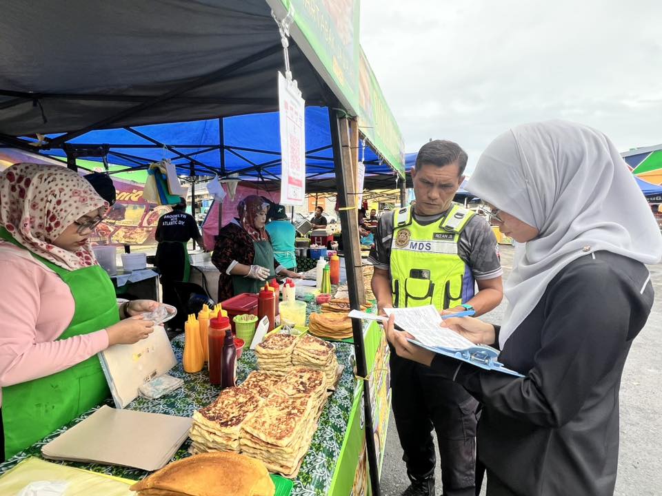 Selain itu, perhatian turut diberikan kepada penyediaan tong sampah bertutup dan pengurusan sisa pepejal yang sistematik bagi memastikan kawasan bazar sentiasa bersih dan bebas daripada bau serta kehadiran serangga perosak. Status suntikan tifoid dan sijil latihan pengendali makanan juga diperiksa bagi memastikan pematuhan terhadap peraturan kesihatan yang ditetapkan.