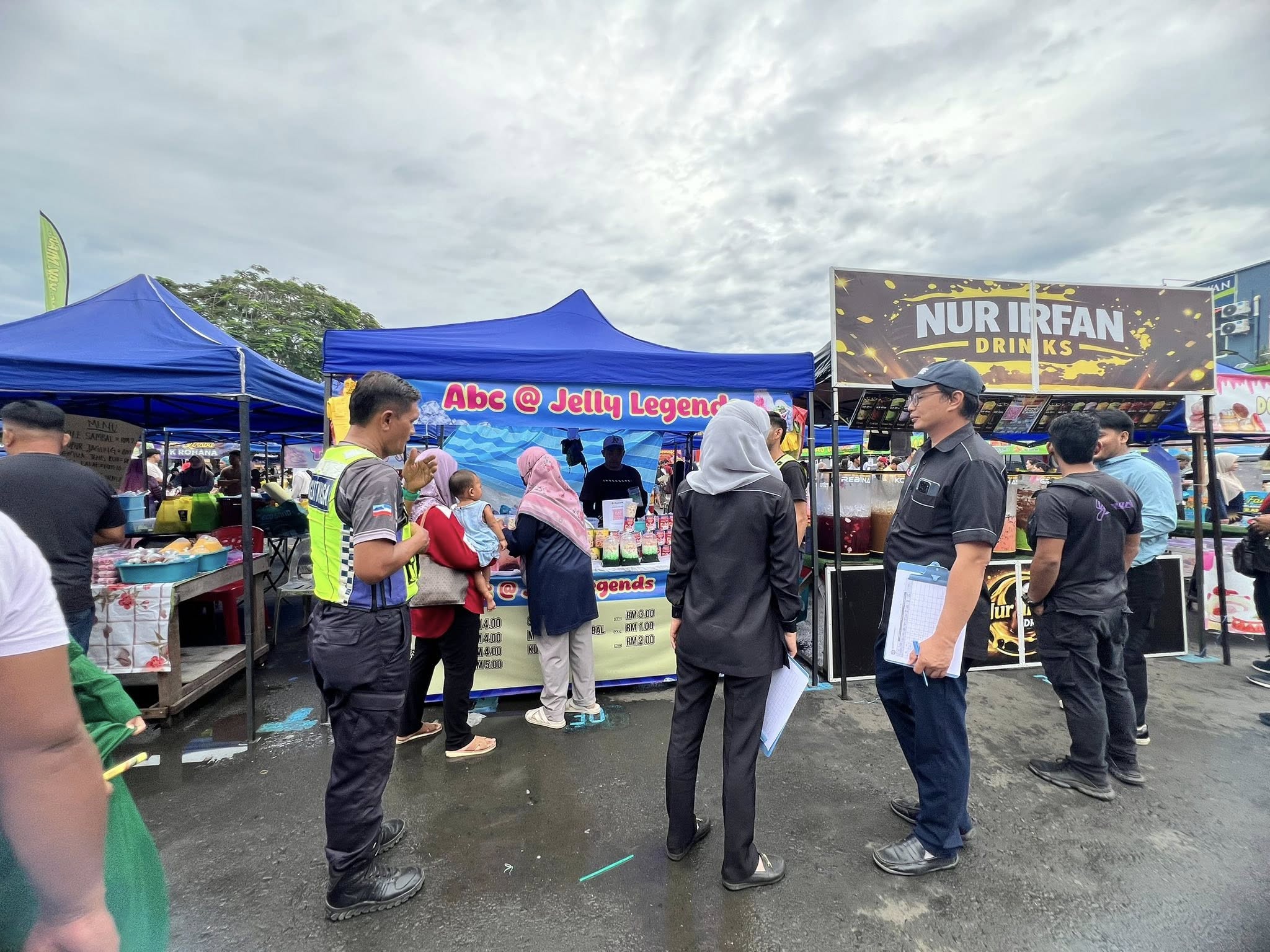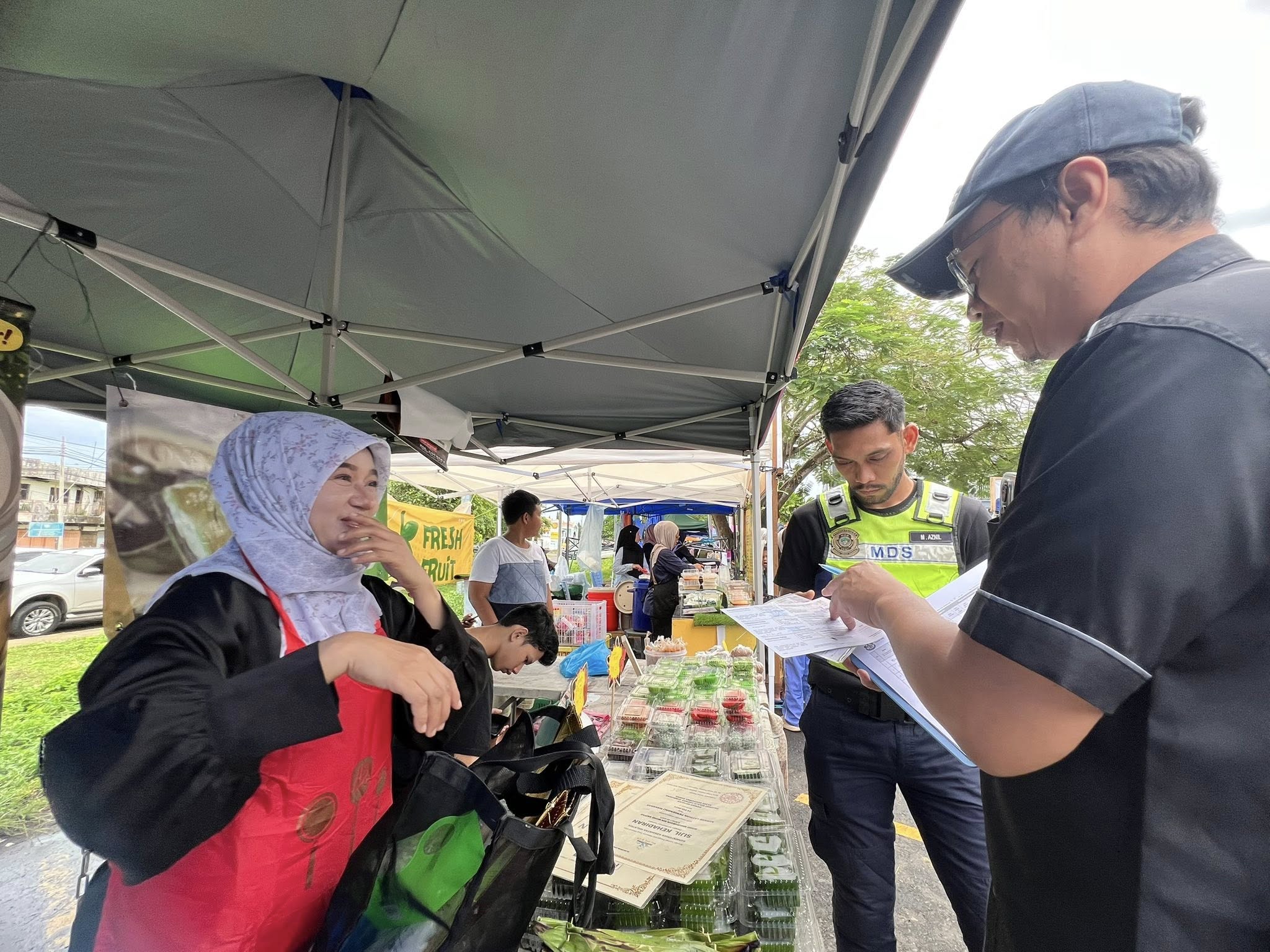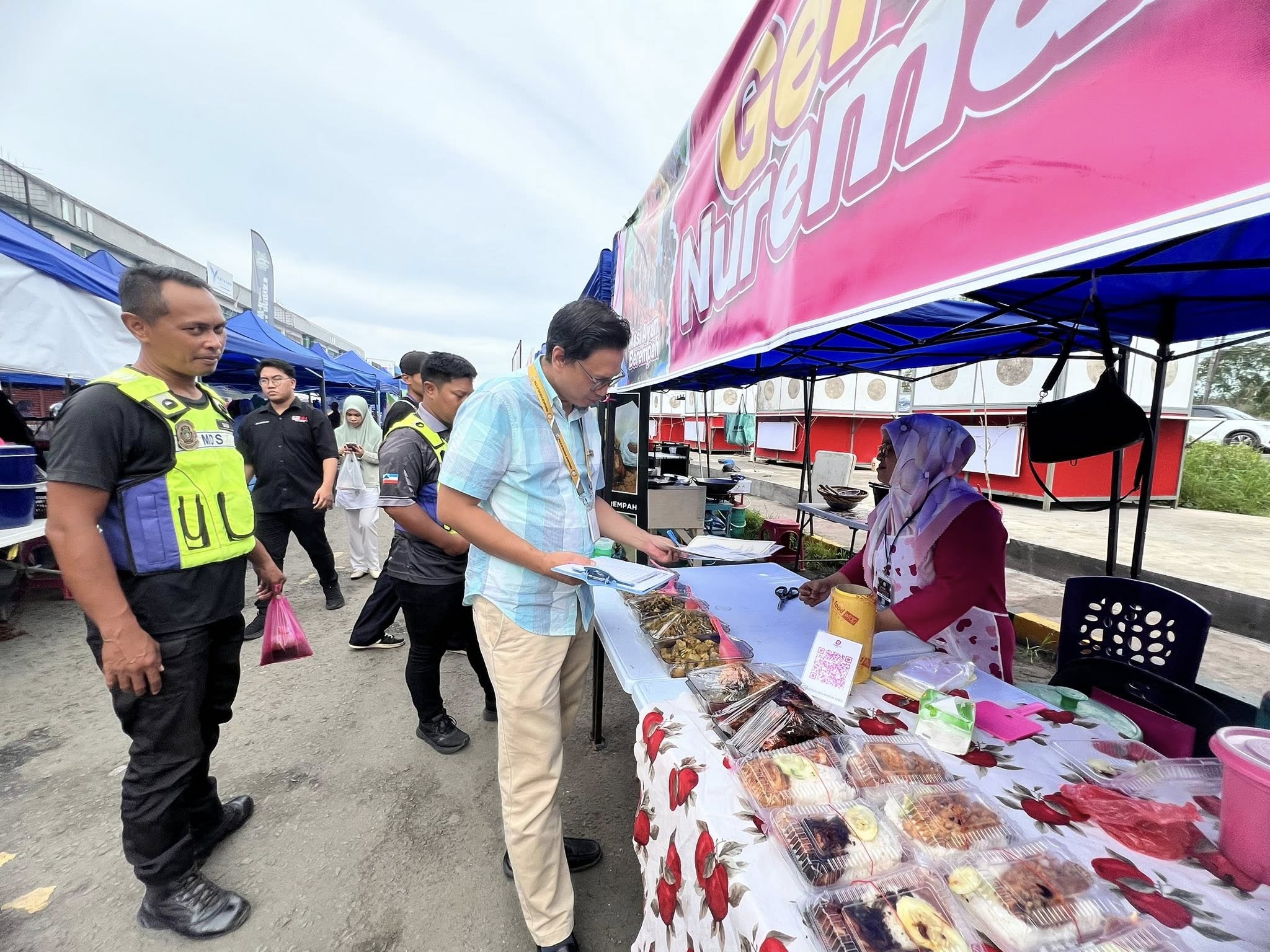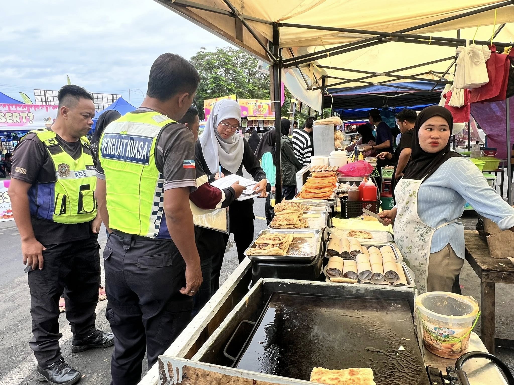 Selain itu, perhatian turut diberikan kepada penyediaan tong sampah bertutup dan pengurusan sisa pepejal yang sistematik bagi memastikan kawasan bazar sentiasa bersih dan bebas daripada bau serta kehadiran serangga perosak. Status suntikan tifoid dan sijil latihan pengendali makanan juga diperiksa bagi memastikan pematuhan terhadap peraturan kesihatan yang ditetapkan.