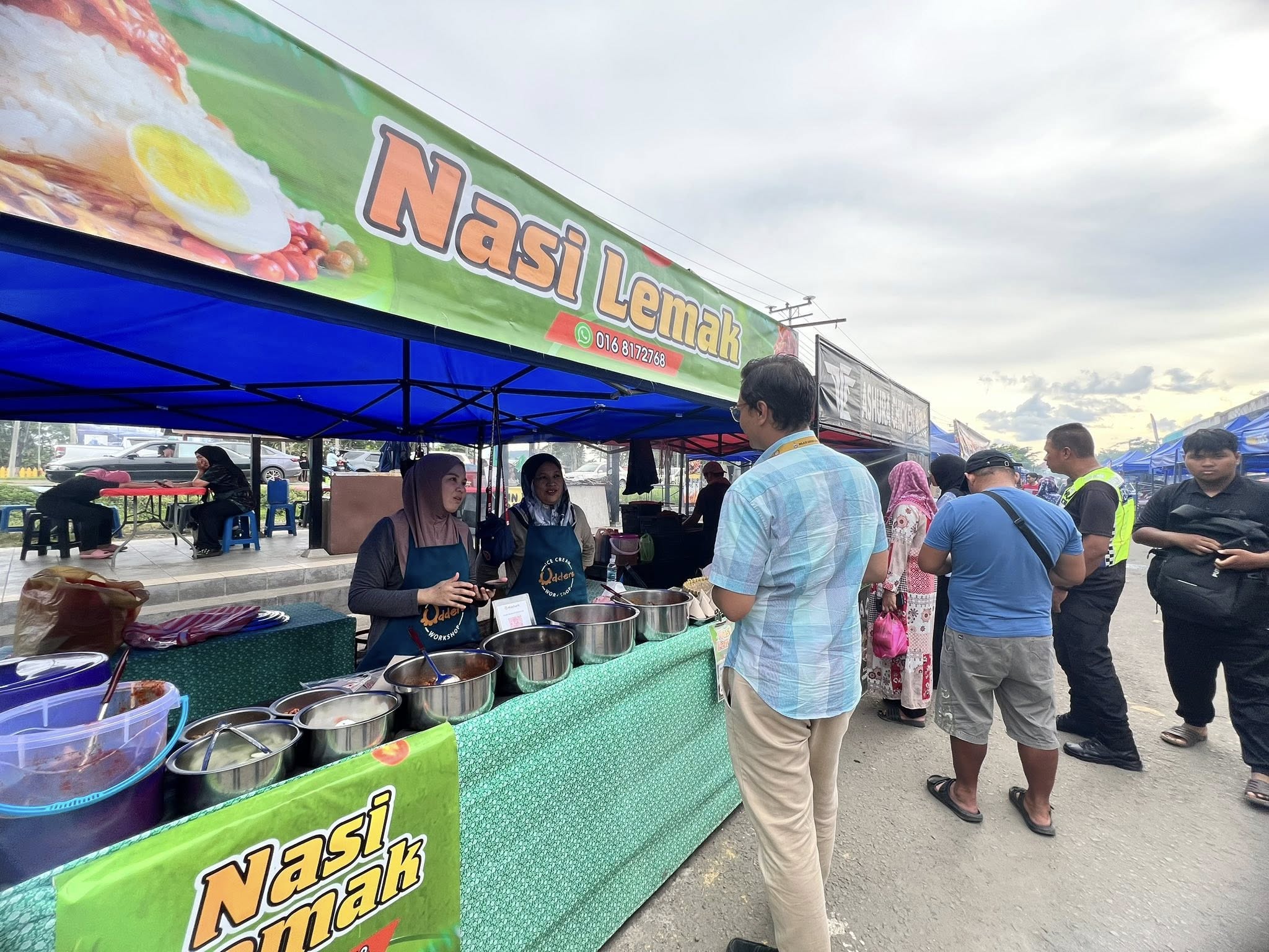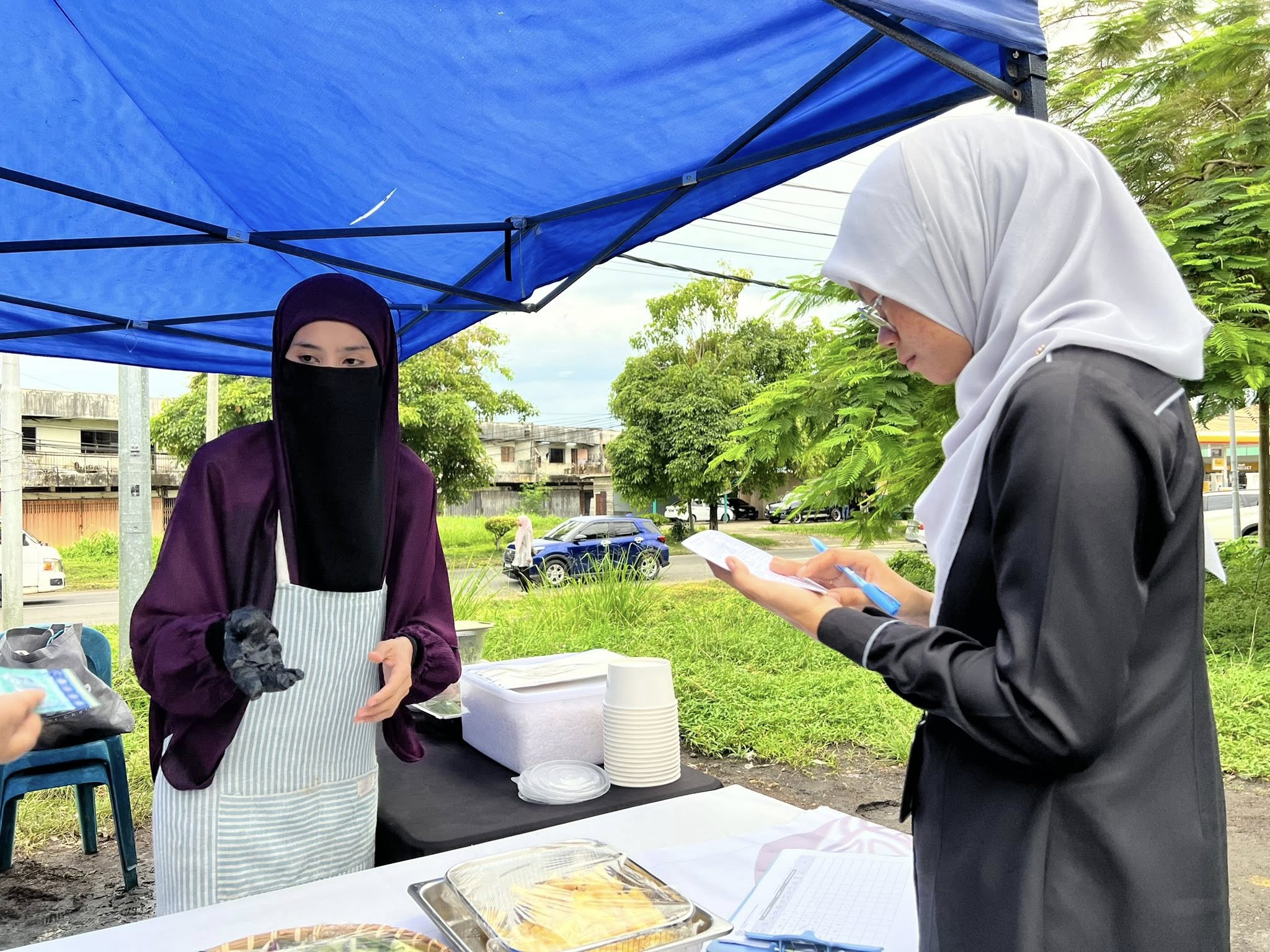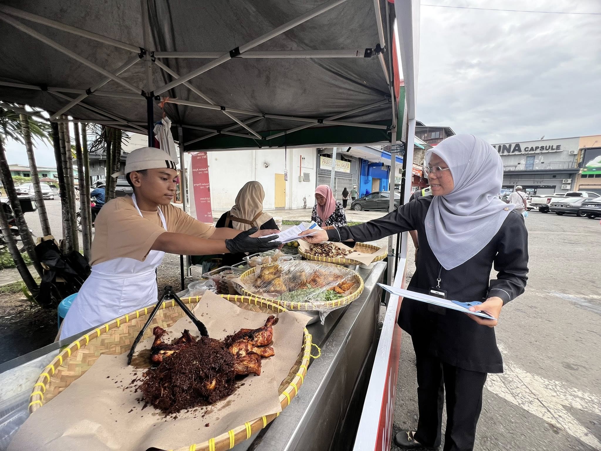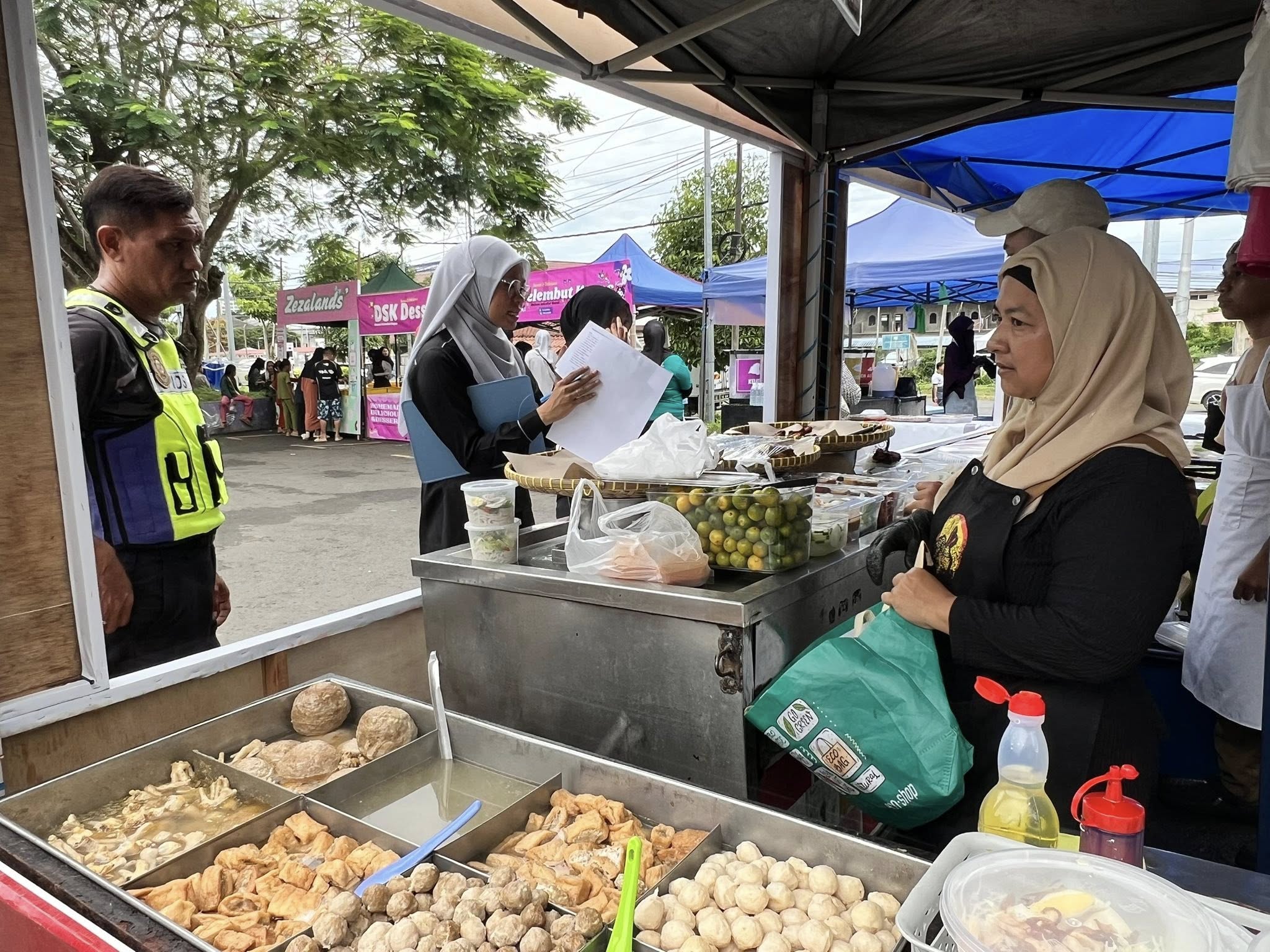 Selain itu, perhatian turut diberikan kepada penyediaan tong sampah bertutup dan pengurusan sisa pepejal yang sistematik bagi memastikan kawasan bazar sentiasa bersih dan bebas daripada bau serta kehadiran serangga perosak. Status suntikan tifoid dan sijil latihan pengendali makanan juga diperiksa bagi memastikan pematuhan terhadap peraturan kesihatan yang ditetapkan.